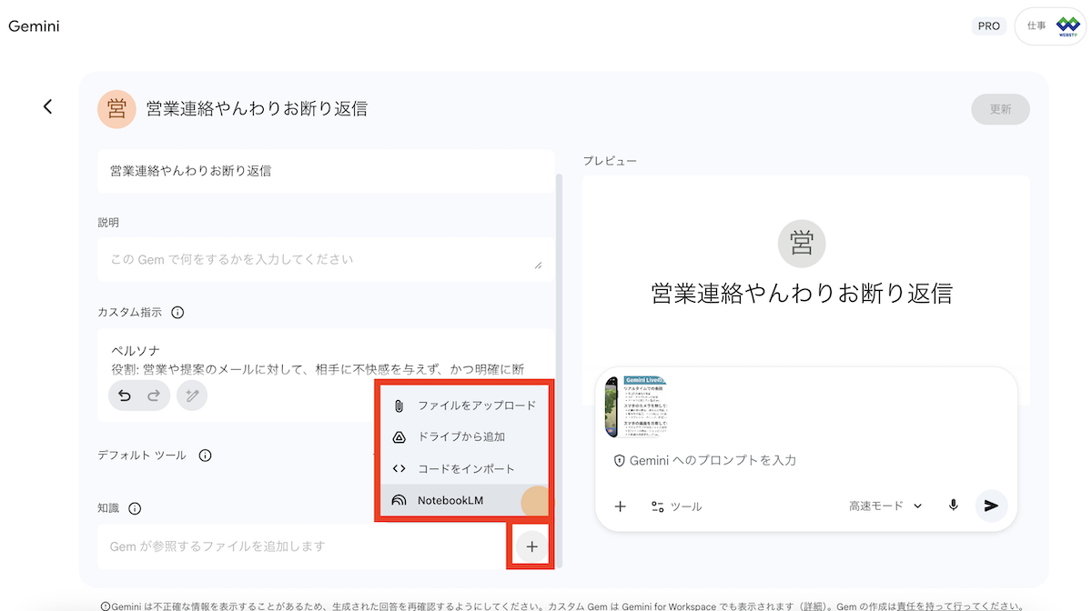 これにより、「特定の役割やルールを持ったAI(Gem)」に「自社専用の正確な知識(NotebookLM)」を掛け合わせることが可能になりました。