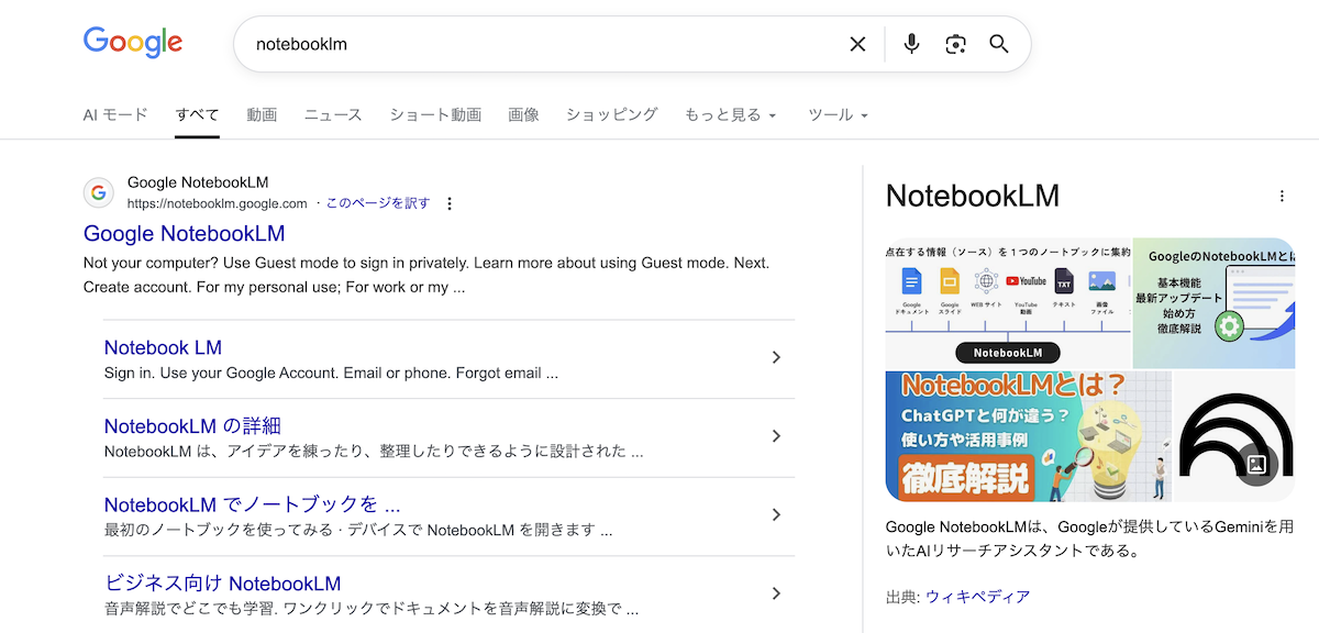 Googleで「NotebookLM」と検索し、公式サイトへアクセス、Googleアカウントでログインします。