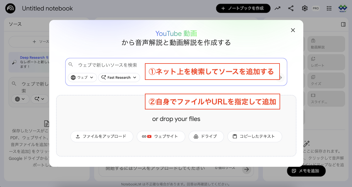 NotebooKLMの使い方は簡単。公式サイトにアクセスして調べたいソース(URLやpdfなど)を指定するだけです。動画本編の01:23〜で解説