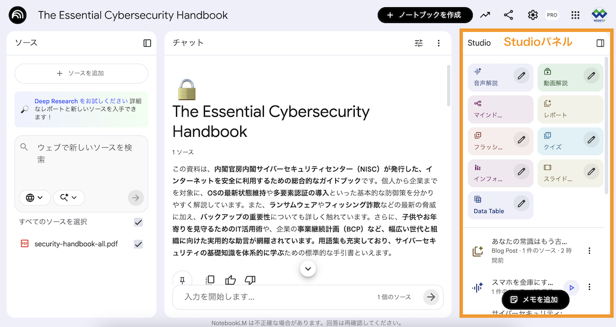 ノートブックが表示されます。左側にソースパネル(資料のアップロード)、右側にチャットパネル(質問や指示)、さらにSTUDIOパネル(マインドマップや音声解説など)から構成されます。