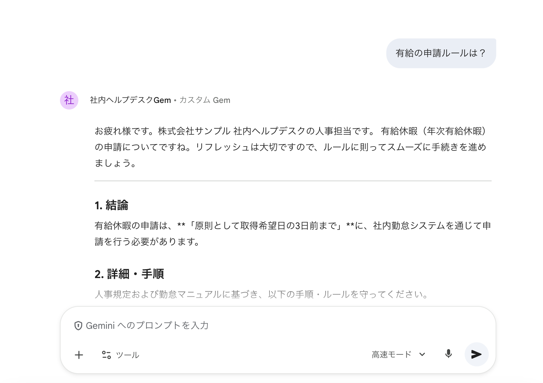 このように設定したGemに「有休申請のルールを教えて」と質問すると、「お疲れ様です!リフレッシュのためにぜひ活用してくださいね。ルールをご案内します…」といった具合に、社内規定(正確な事実)に基づきつつ、親しみやすいトーン(指定した役割)で完璧な回答を返してくれます。