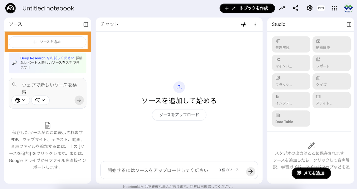 NotebookLMは、大量のソース(PDF、URL、テキストなど)を読み込ませ、その内容に基づいた回答を出力するツールです。