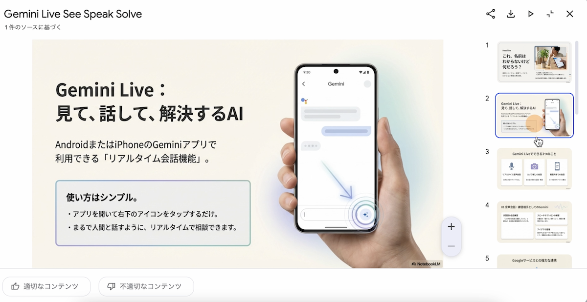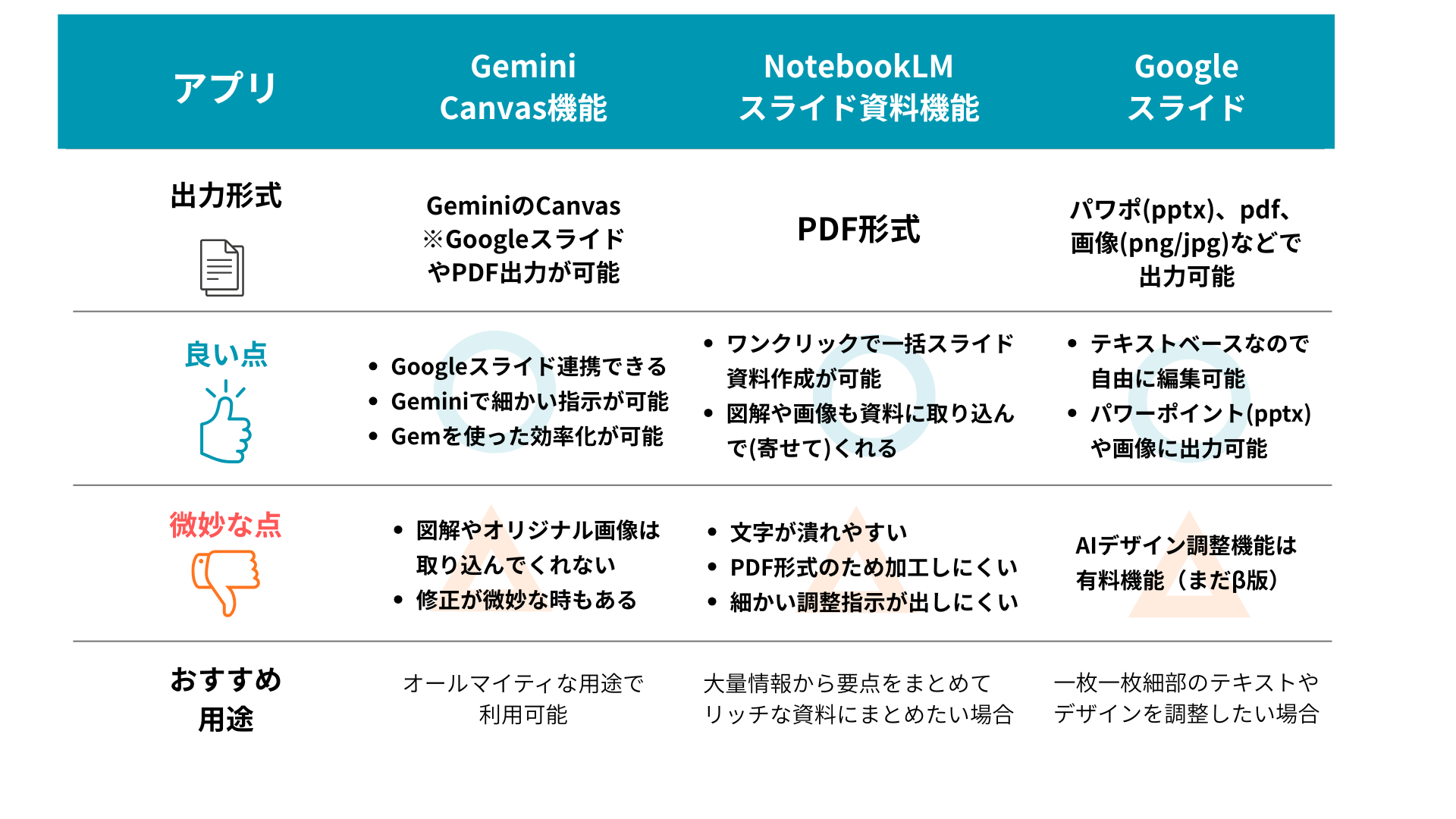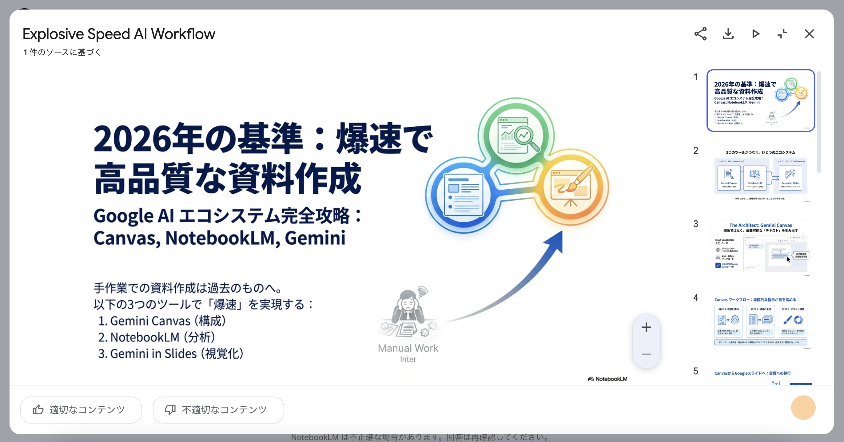 まずはNotebookLMでざっくり全体像をつかみ、Gemini Canvasで構成を練り、仕上げにGoogleスライドで整えるといった組み合わせも可能です。