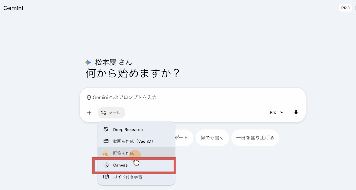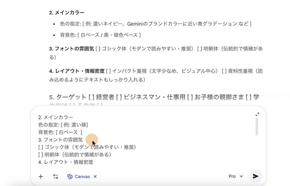 まず基本となるのが、GeminiのCanvas機能を使った方法です。これは、対話形式でスライドの構成からデザイン案までを作成してくれる強力なツールです。