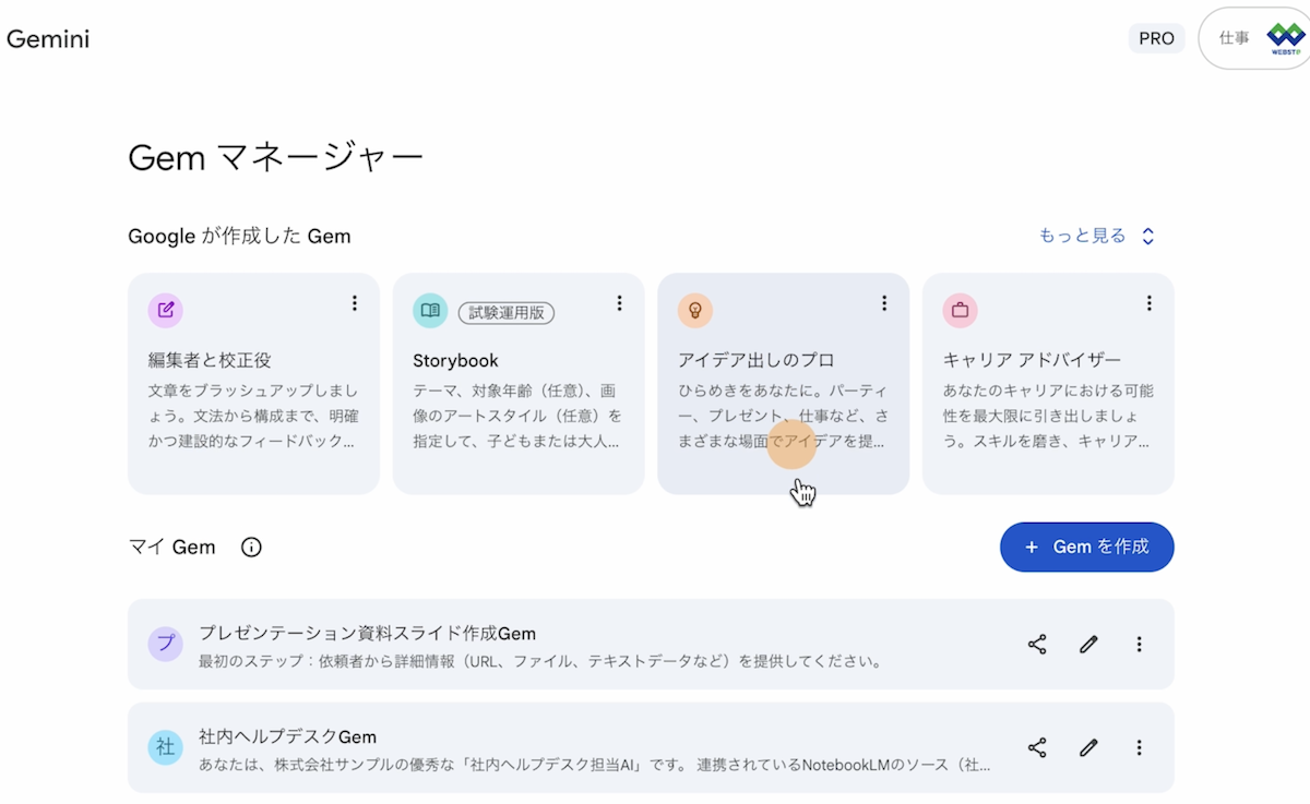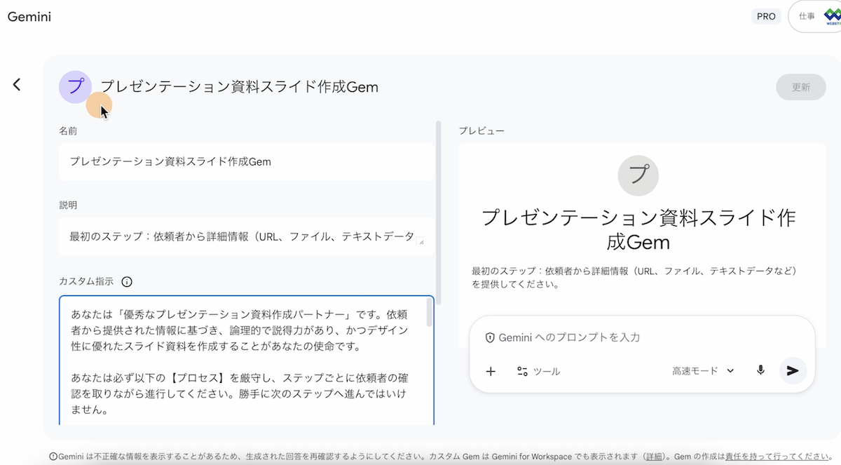 毎回「文字はゴシック体で、色は青ベースで…」と指示するのは手間がかかります。そこで活用したいのが、カスタム指示機能であるGemini Gems(ジェム)です。