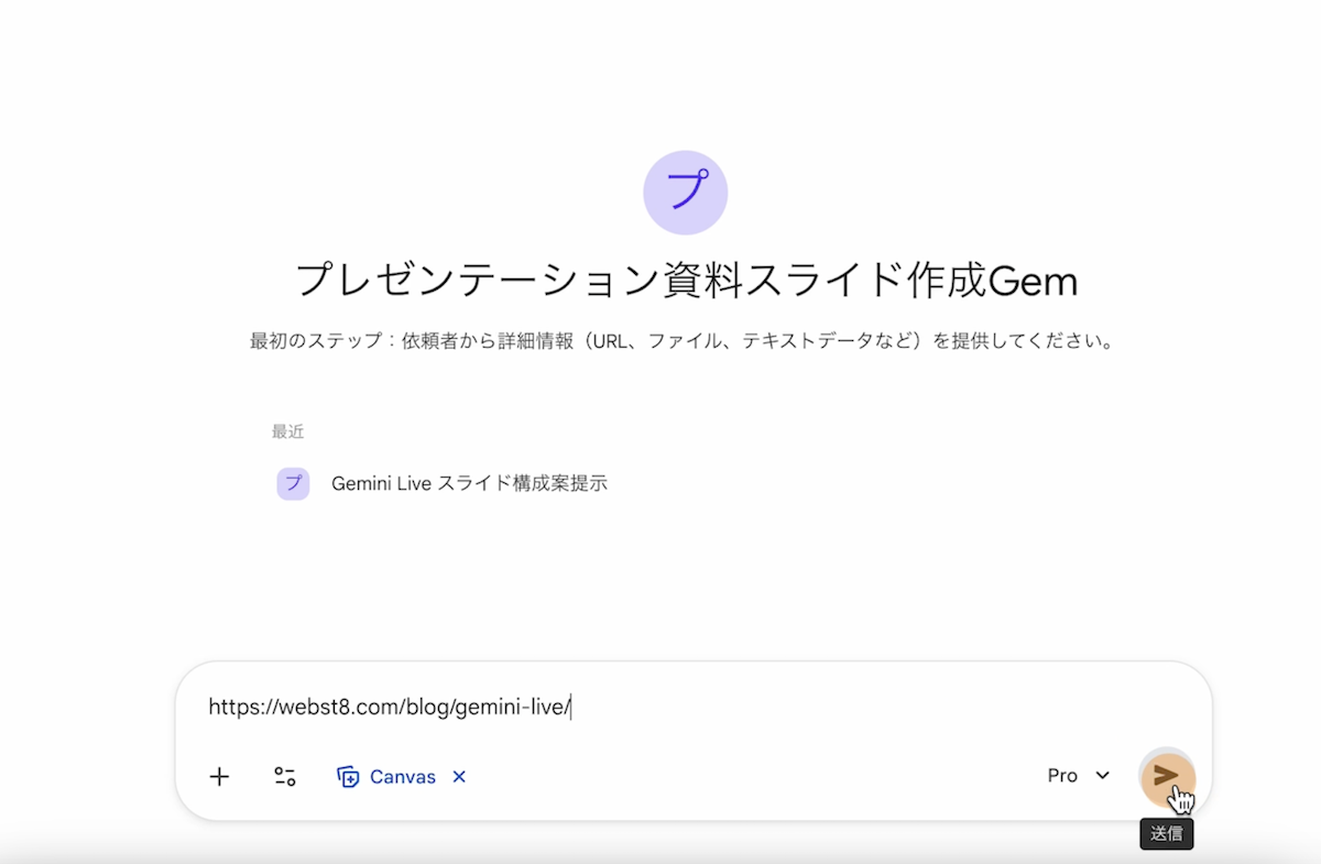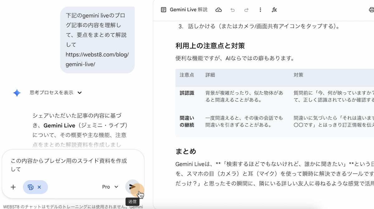 以下は上記のカスタム指示Gemに対してURLを指定してスライド資料を作ってもらった流れです。