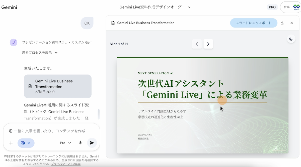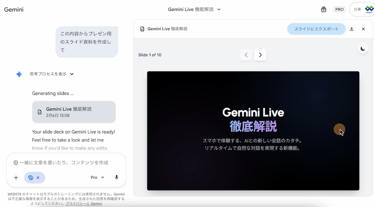 Gemini上で作成されたスライドは、「Googleスライドにエクスポート」でエクスポートできます。