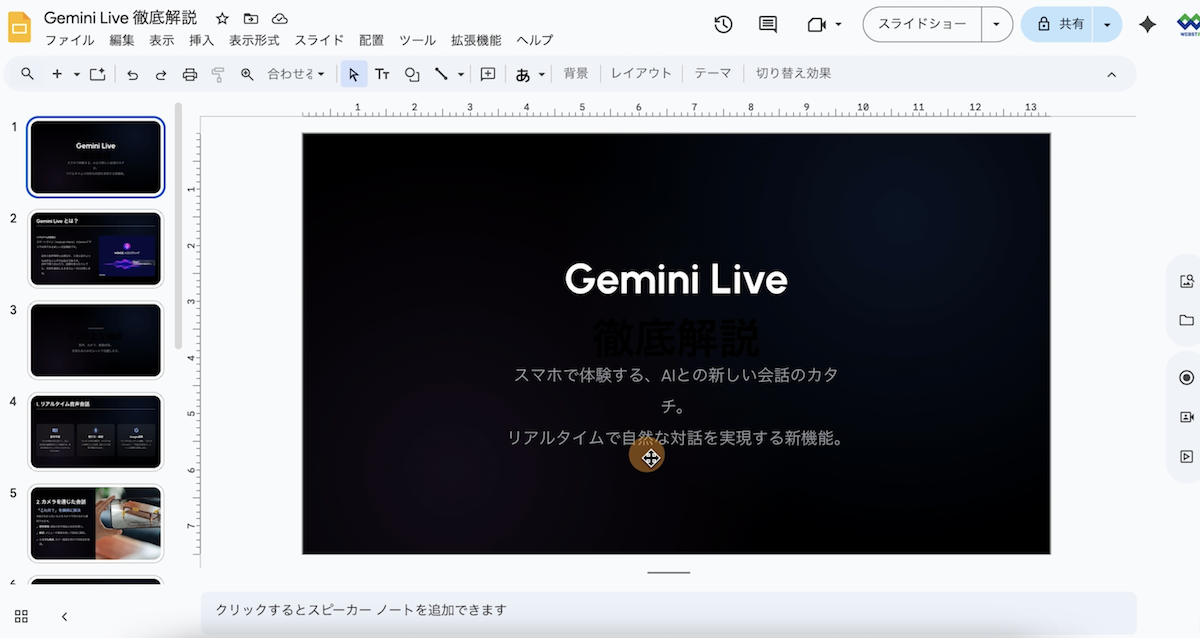 Google Workspaceの有料版(Standard以上など)を使用している場合、Googleスライド上で直接Geminiを呼び出すことができます。