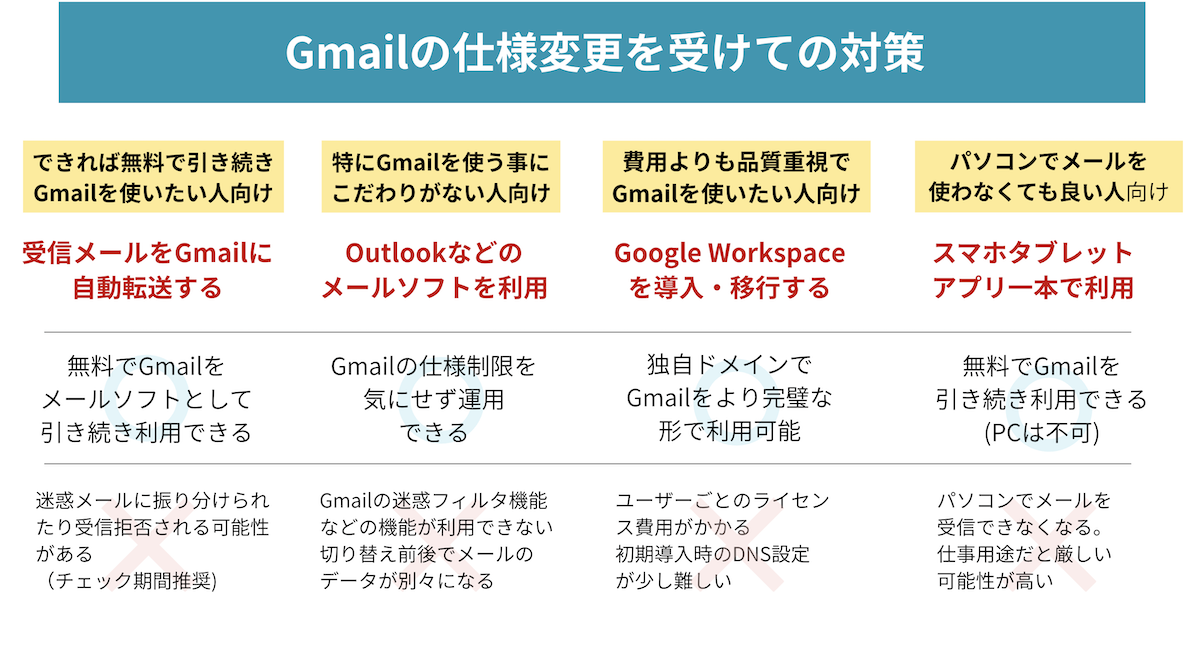 | ⭕ 無料でGmailをメールソフトとして引き続き利用できる | ⭕ Gmailの仕様制限を気にせず運用できる | ⭕ 独自ドメインでGmailをより完璧な形で利用可能 | ⭕ 無料でGmailを引き続き利用できる(PC不可) |