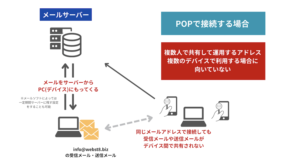 なお、複数のPC・スマホで同じメールアドレスのメールを送受信・操作する場合は、Outlookなどで設定する際にPOPではなくIMAPを使う方が便利です。