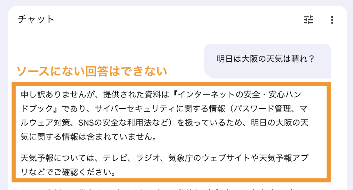 なお、Geminiと違い、情報源(ソース)にない質問をしても回答はしてくれません。