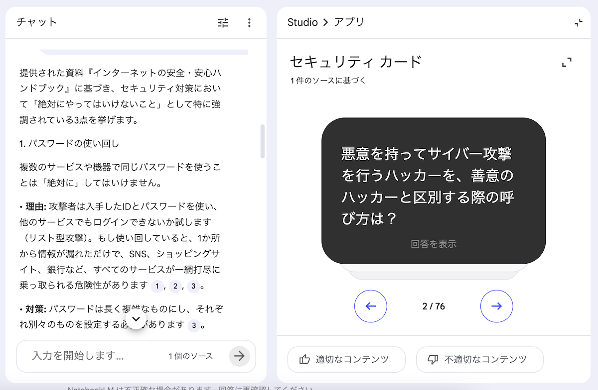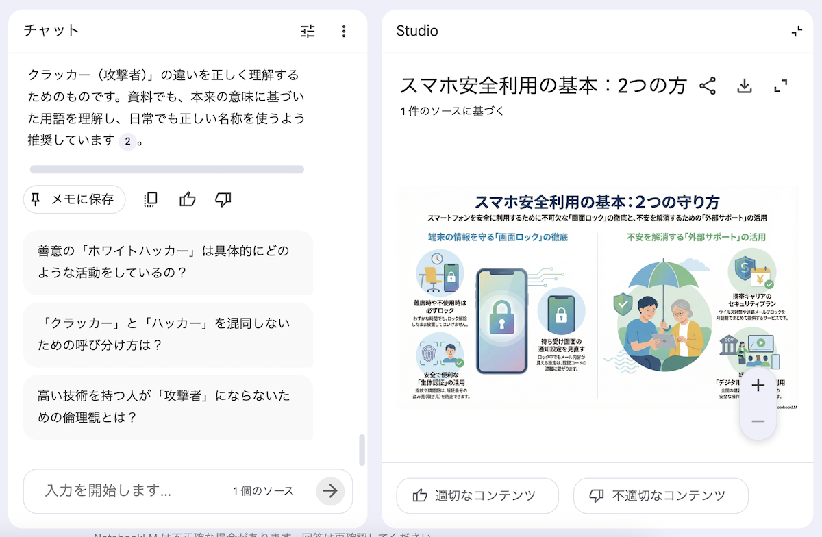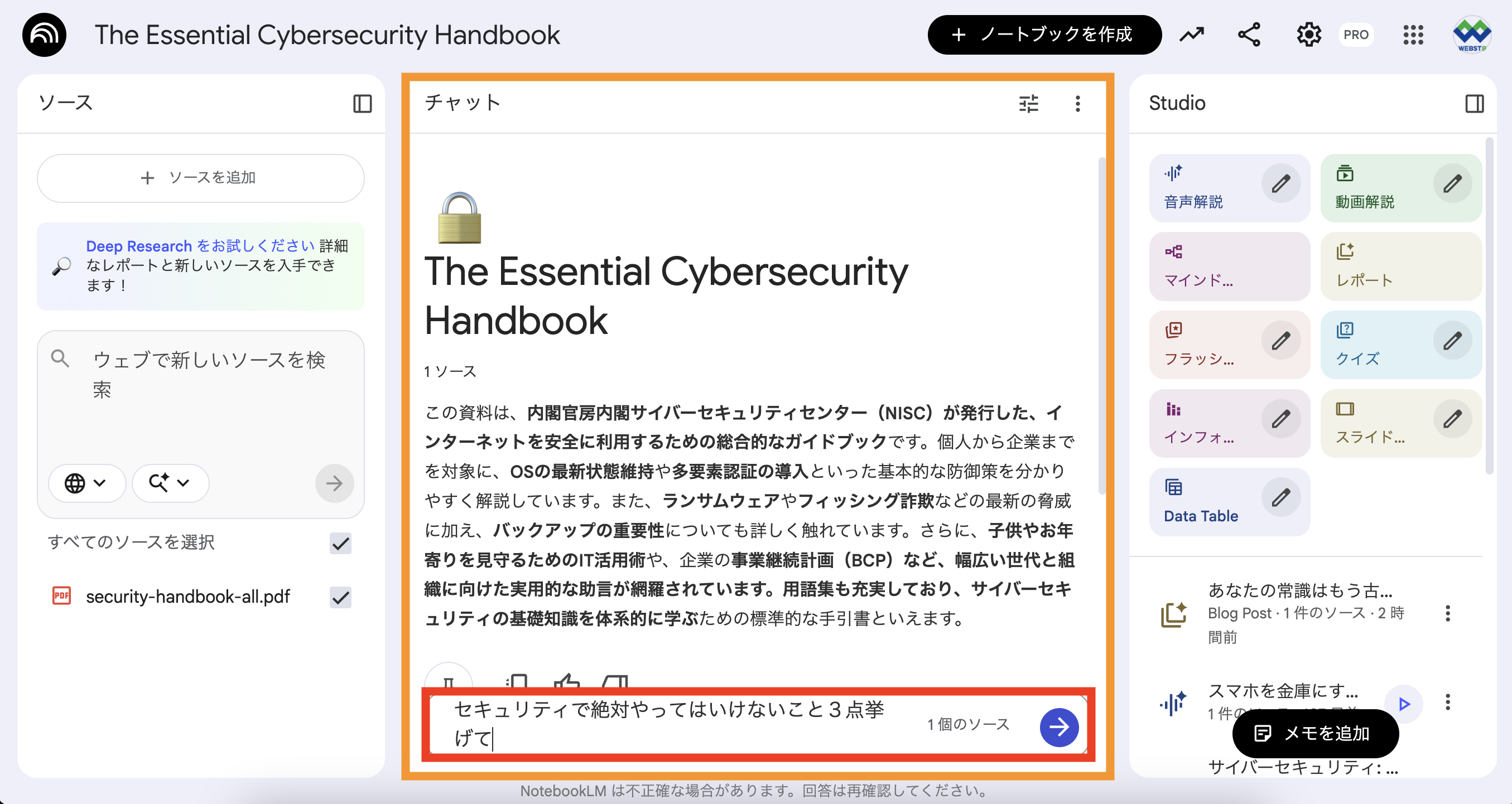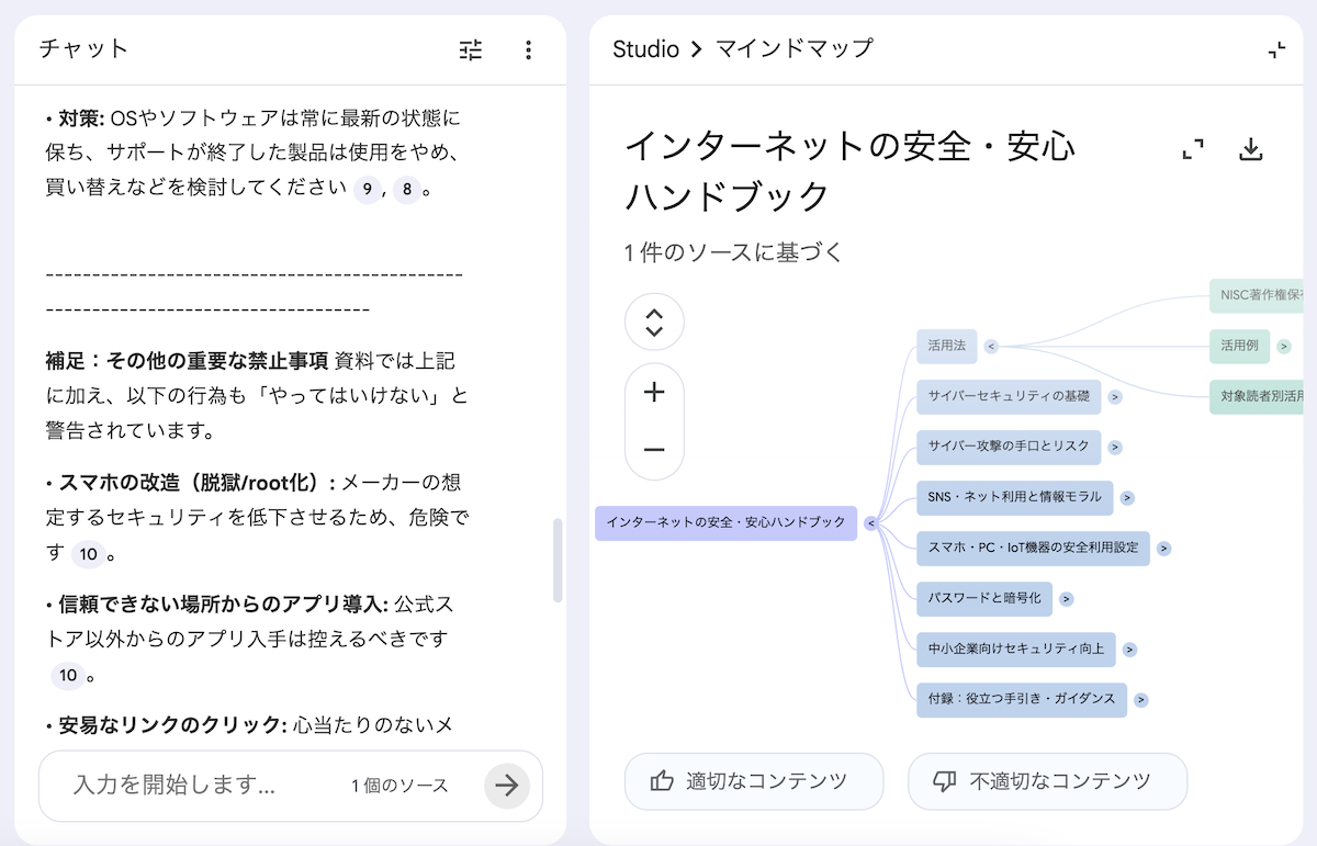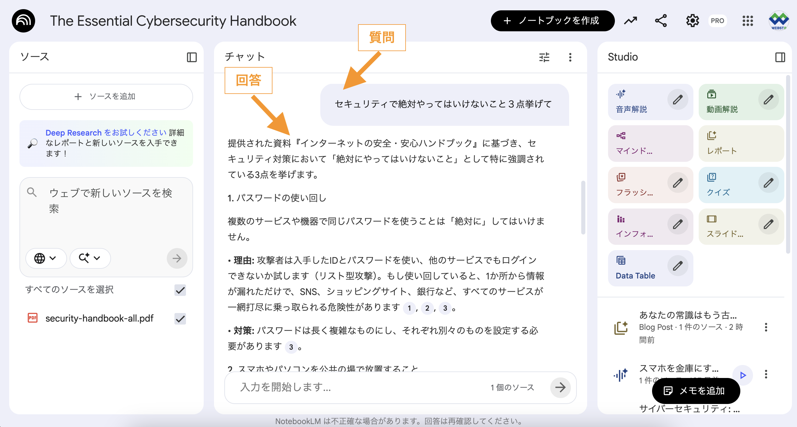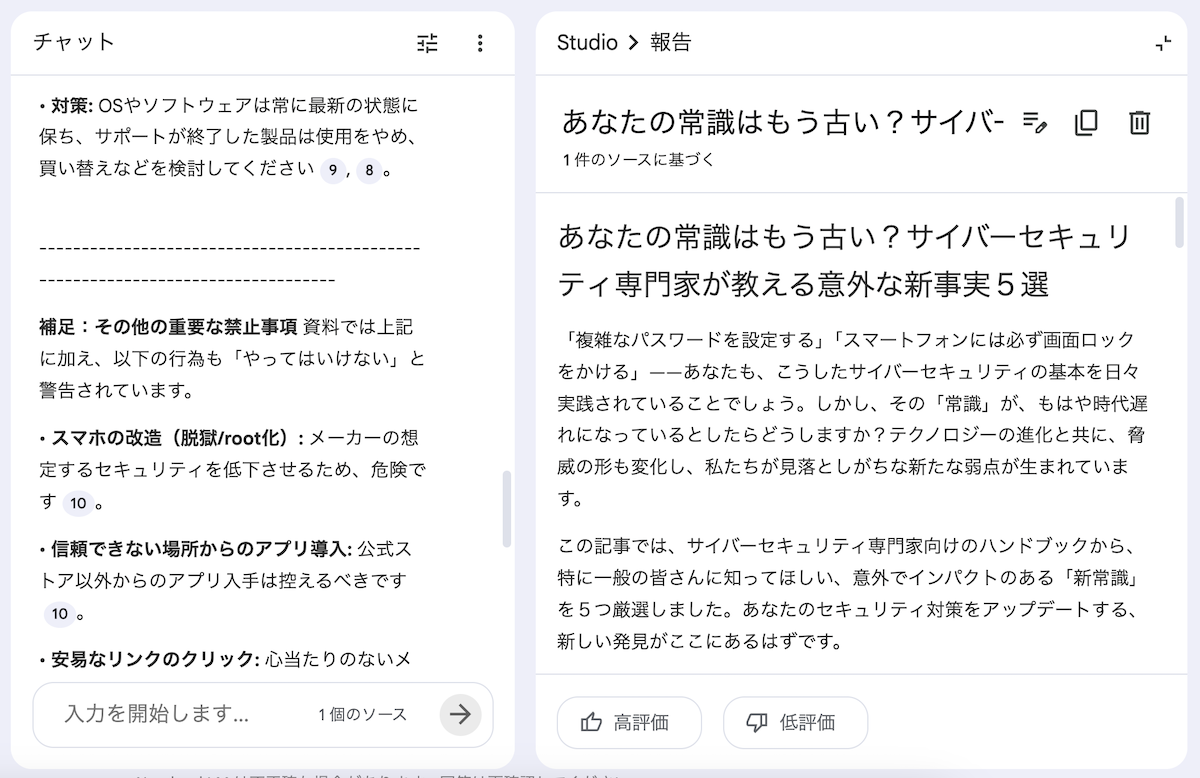 Googleは「NotebookLMのトレーニングに個人データは使用しない」と明言しているため、安心して社内情報を扱えます。