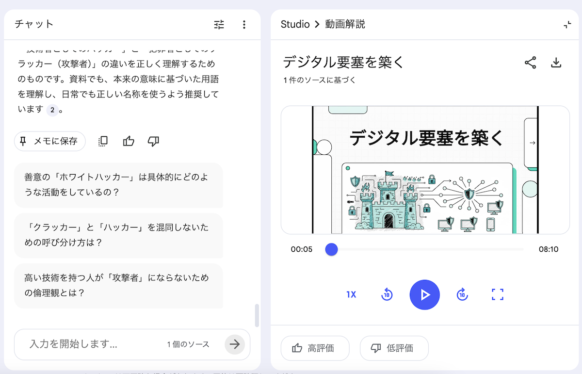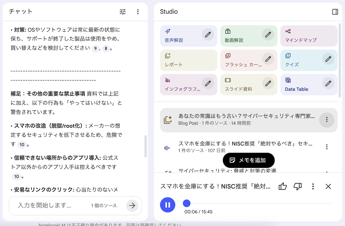 | 視聴・聴取系(インプット用) | 音声解説 | ソースの内容について、2人のAIホスト(英語圏の男女など)がポッドキャスト風に会話する音声を生成します。 |