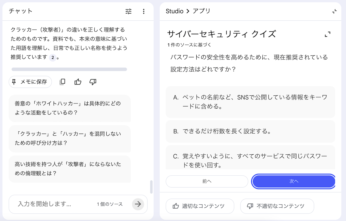 | クイズ | ソースの内容に基づいて、理解度を確認するための問題(選択式や記述式など)を作成します。 | |