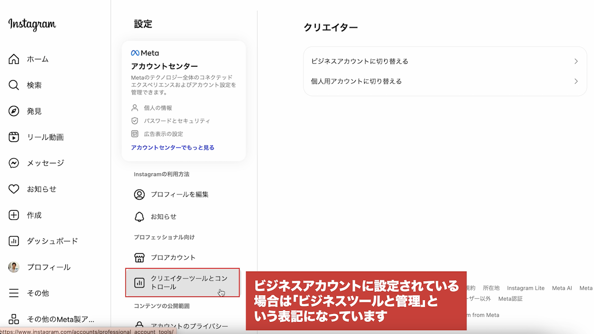 なお、プロフェッショナルアカウントなのにうまくいかない場合は、ビジネスアカウント・クリエイターアカウントを切り替えてから2,3時間程度試してみるとうまくいく場合があります。
