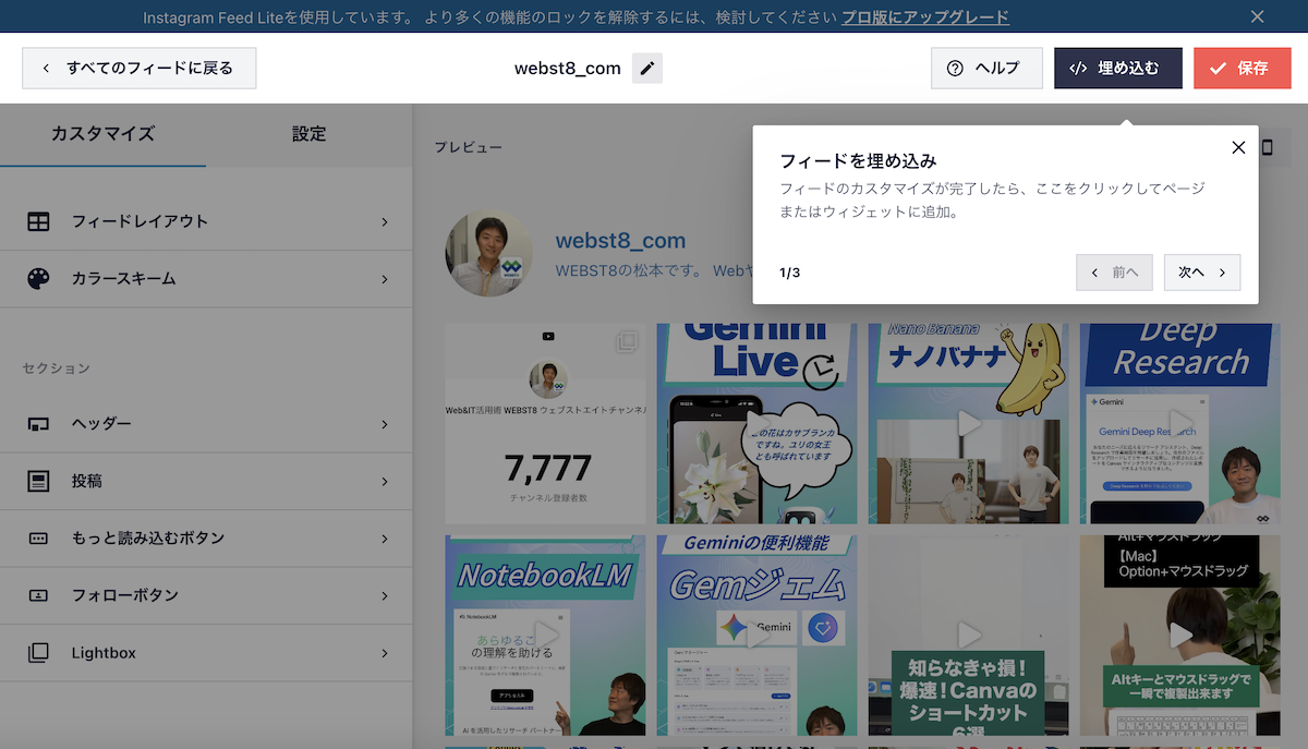 有料版では、「ハッシュタグフィードの表示」や「カルーセル、レンガ状といったレイアウトでのフィードの表示」、「ポップアップライトボックスで投稿を表示」といったより高度な設定ができるようになります。