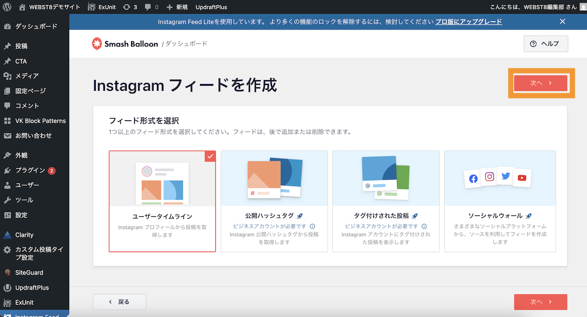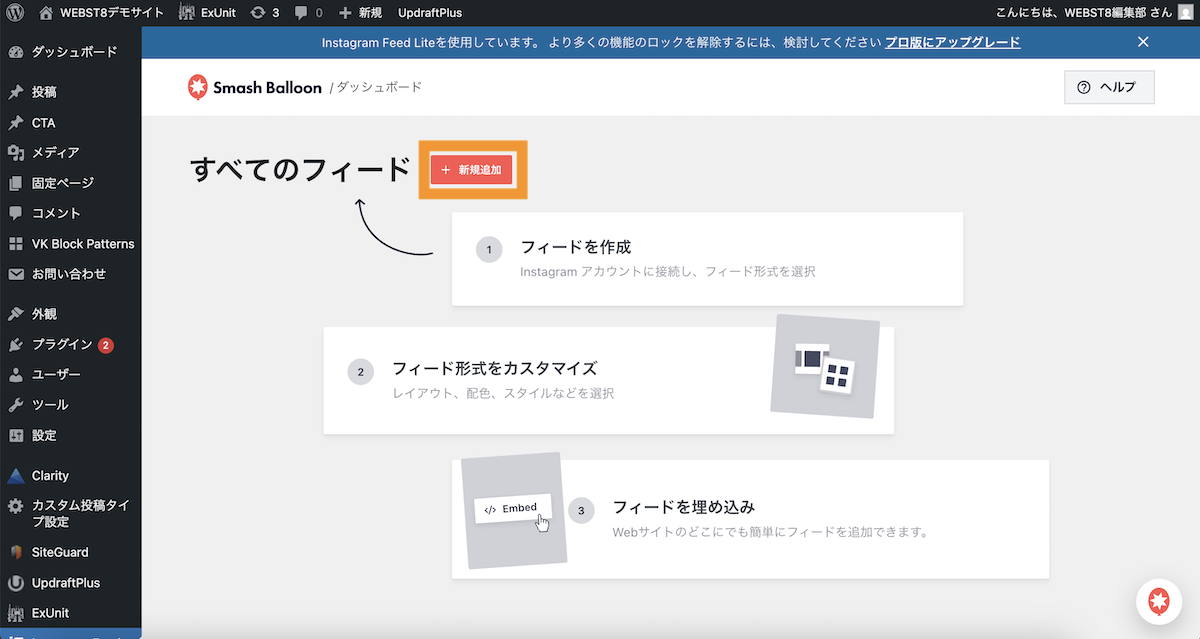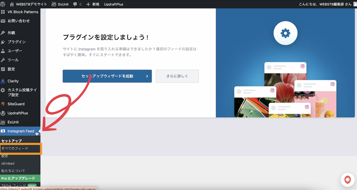 プラグインインストール直後はInstagram Feedのセットアップ画面に移動していますが、ここではいったんInstagram Feed>すべてのフィードに移動します。