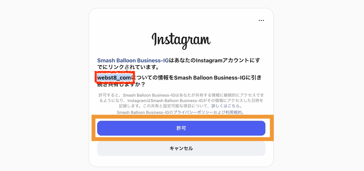 ここで追加したい新たなインスタグラムアカウントにログインし、「許可する」をクリックします。(※)ログイン画面が出ず1回目に接続したInstagramアカウントに自動接続される場合は、いったんPC上でInstagramをログアウトして再度試してみてください。