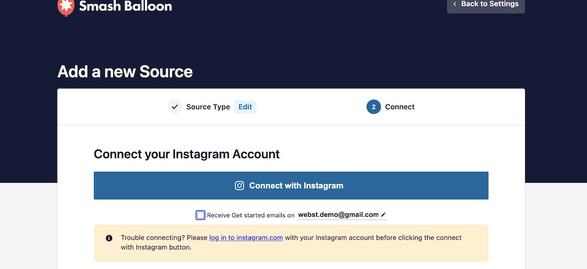 「+ 新規追加」ボタンをクリックすると、初回と同様に以下の画面が出てくるので、ここでアカウントタイプ「Personal」を選択して「Receive Our Get Started emails」のチェックを外してから「Login with Instagram」をクリックします。